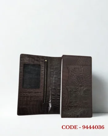 A very stylish and elegant long wallet made from premium crocodized leather, featuring a YKK zipper, magnetic closure, extra chamber, and space to carry two phones.