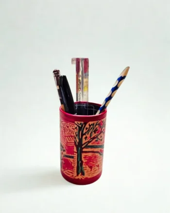 A colorful, round-shaped leather pen holder with a beautiful and unique design. Perfect for keeping your desk organized while adding a touch of style and elegance.