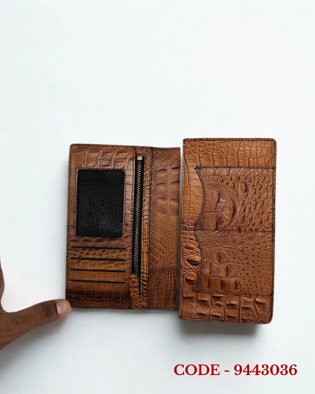 A very stylish and elegant long wallet made from premium crocodized leather, featuring a YKK zipper, magnetic closure, extra chamber, and space to carry two phones.