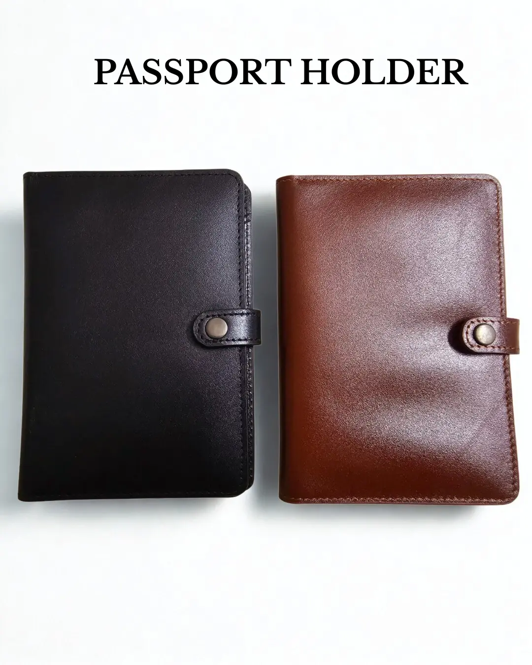 A stylish leather passport holder with a secure button closure. Designed to keep your passport safe, organized, and easily accessible during travel.
