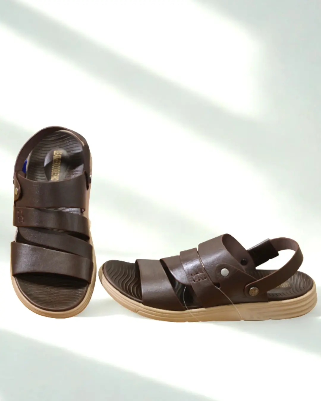 Premium finish leather sandals featuring a genuine leather upper with Phylon insole and outsole for lightweight comfort. Designed with adjustable belts for a secure fit, offering durability for rough use and a stylish look that suits men of every age.