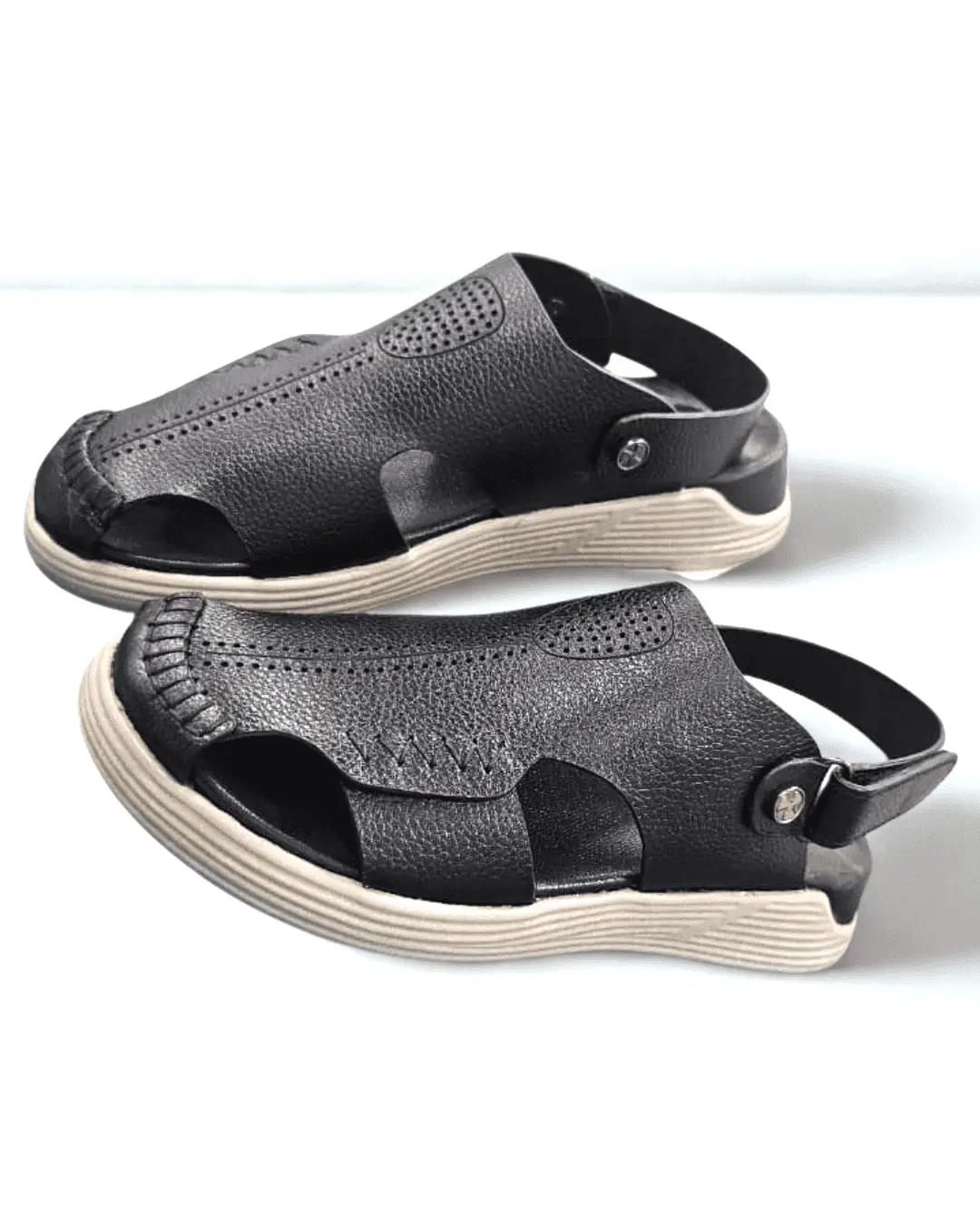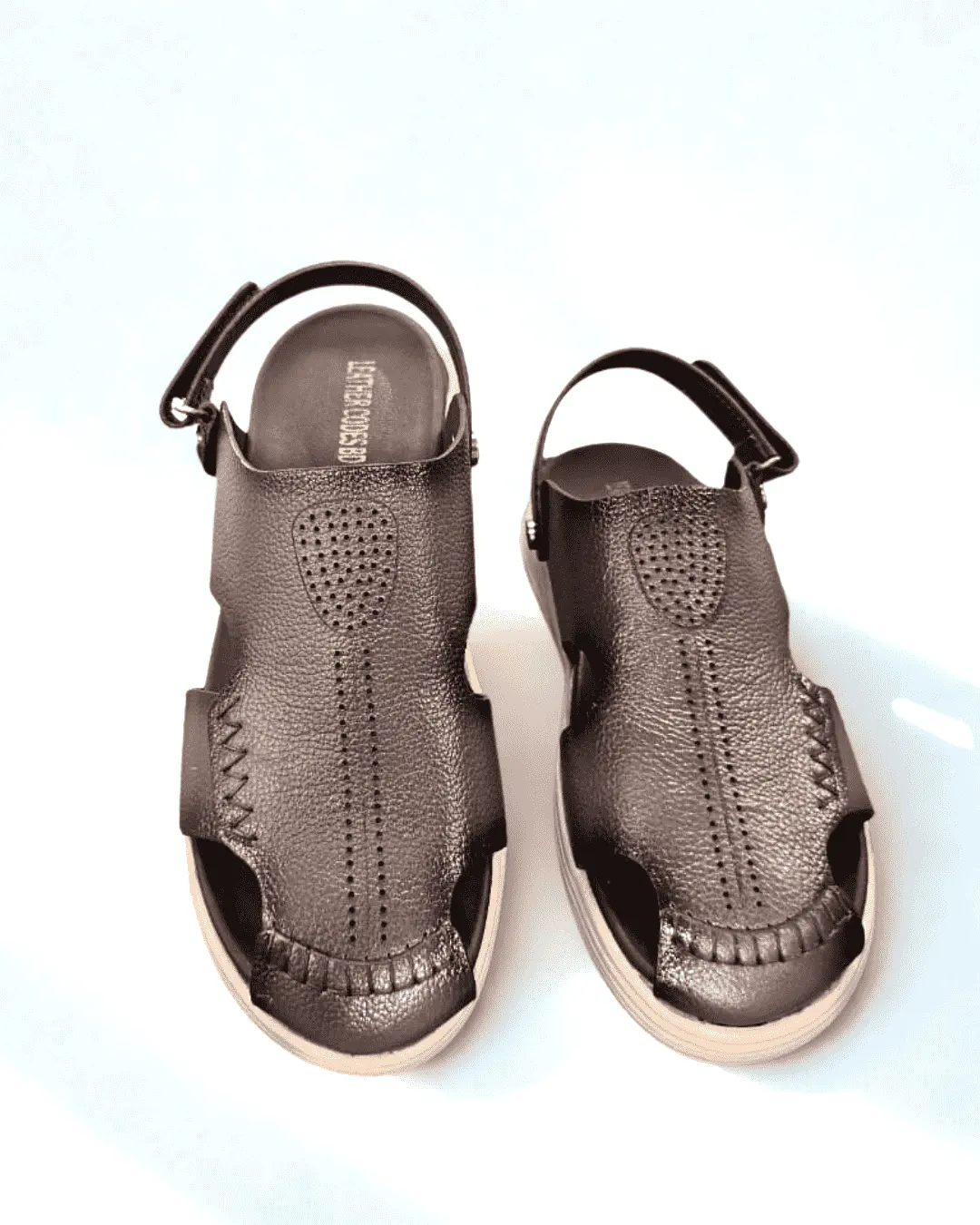 Stylish finish leather sandals with genuine leather upper and Phylon insole and outsole. Back-belt design ensures a secure fit. Perfect for cycling, Punjabi/traditional wear, rough use, and suitable for men of all ages.